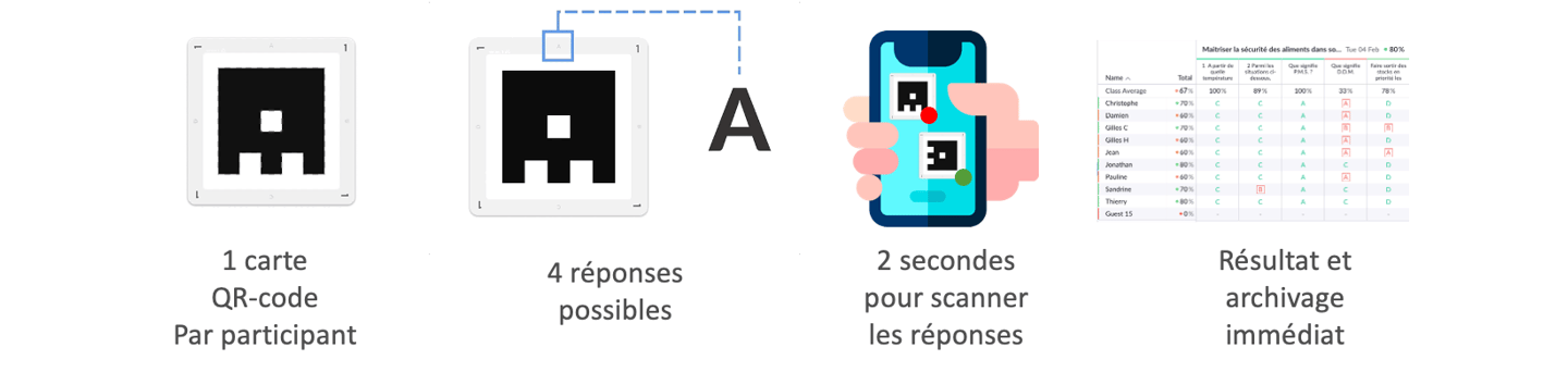 Avec Plickers, l'outils que nous utilisons pour animer les formations et réaliser les questionnaires de validation des acquis, vos stagiaires peuvent répondre simplement à l'aide d'une carte "QR Code" individuelle et bénéficier de tous les avantages d'un vote interactif